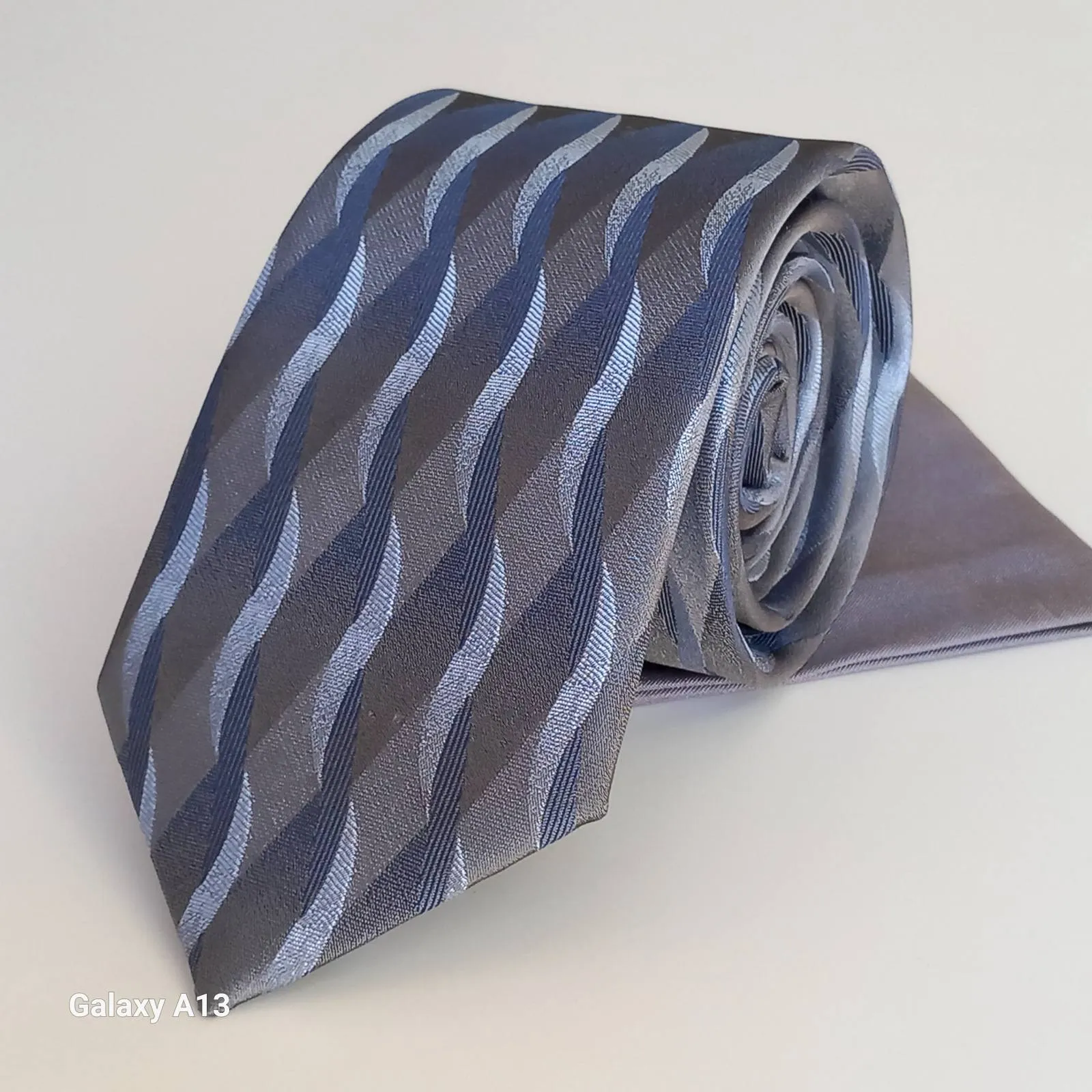 ВЕКК74 100% естествена коприна Бутикова вратовръзка в сиво и синьо с кърпичка – сива