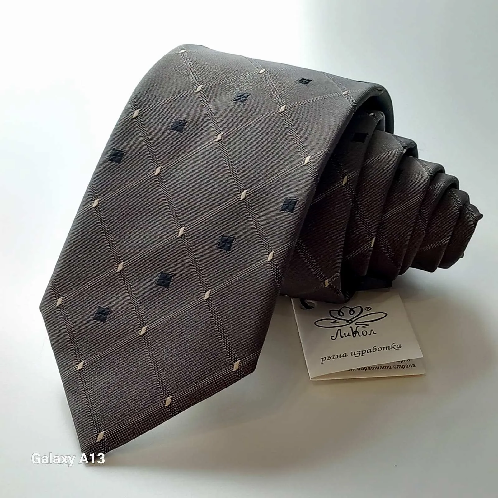 Вратовръзка в кафеникаво сиво с бежово и черно от жакард.