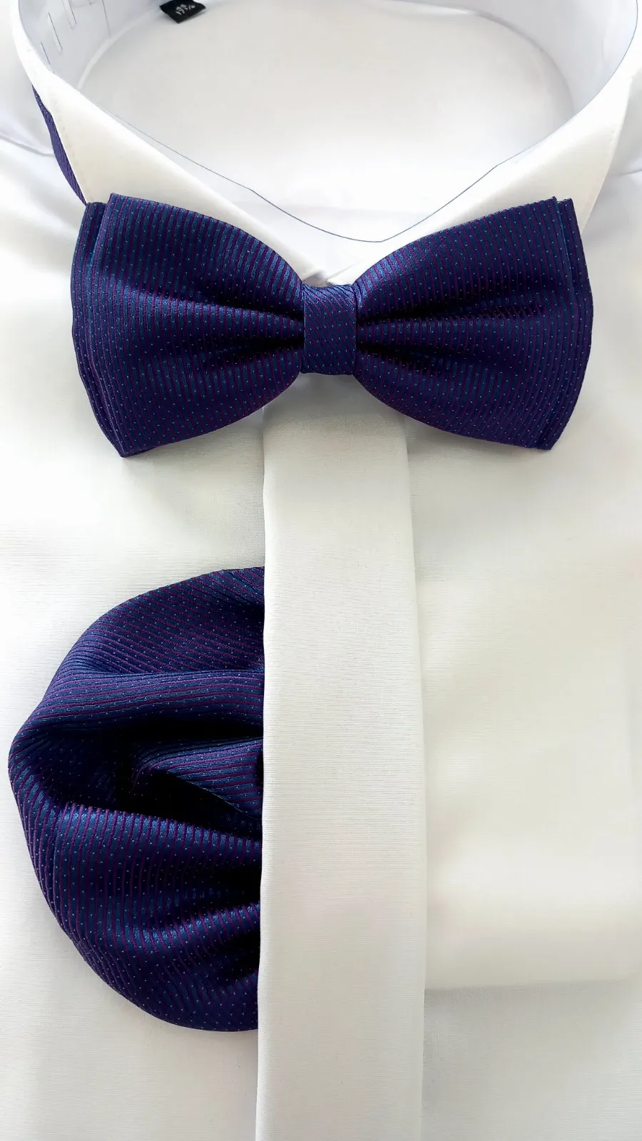 Добавете изтънчен стил към визията си с тази елегантна папийонка от жакард, допълнена с кърпичка в същия дизайн. Материята се отличава с фин лилаво-син хамелеон ефект, който променя нюансите си според светлината и ъгъла на погледа – дискретен, но впечатляващ акцент.