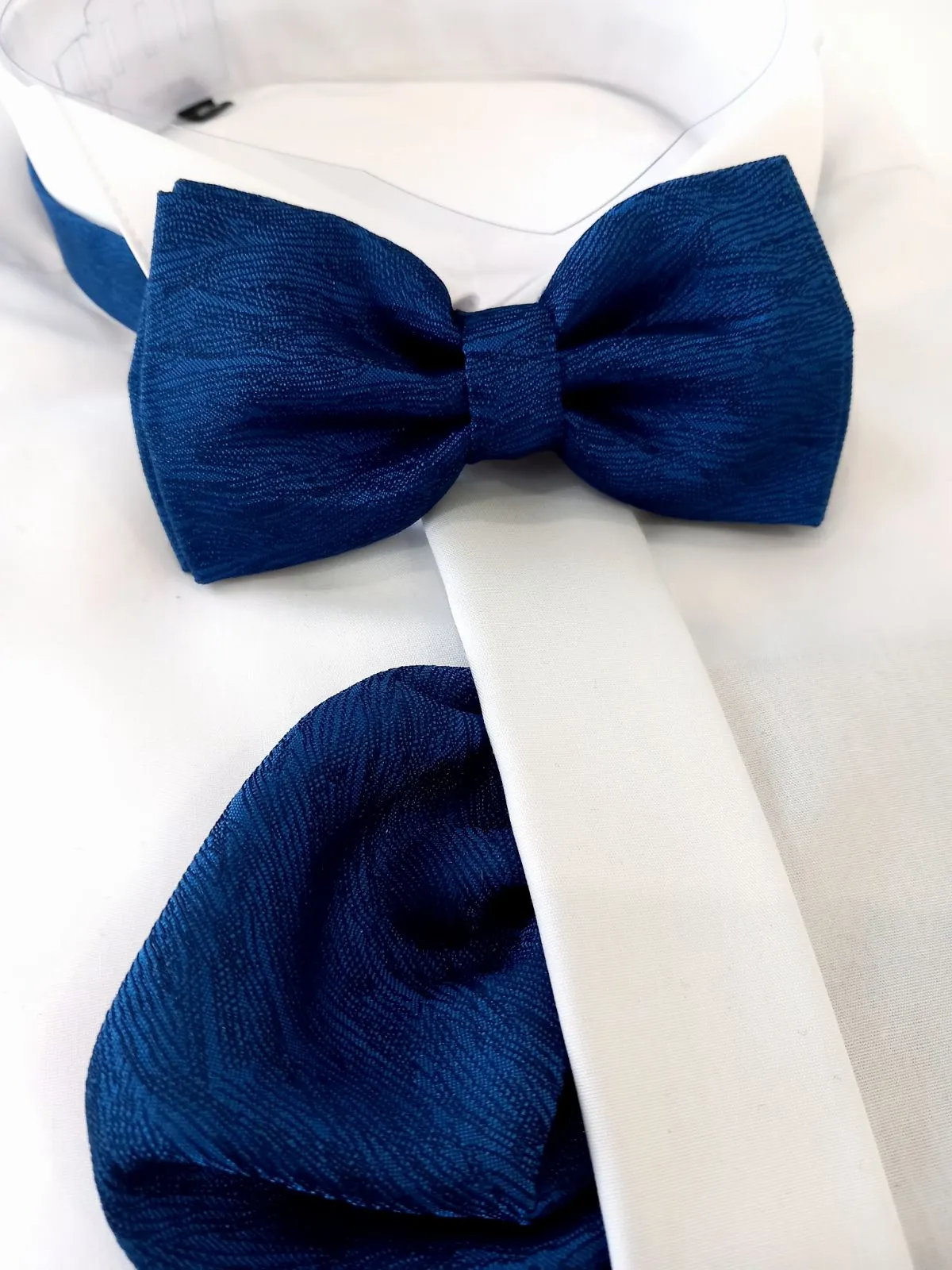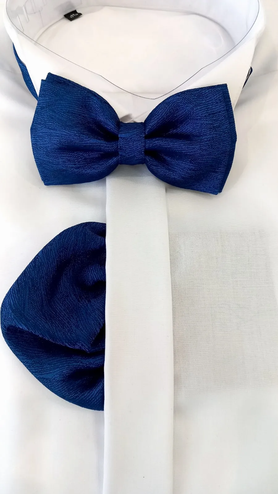 Структурна папийонка в кралскосиньо с кърпичка – стилен и елегантен аксесоар за специални поводи.